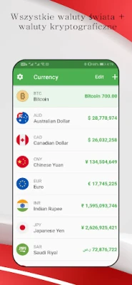 CC Currency Converter wyróżnia się kompleksowością, obejmując szerokie spektrum walut z każdego zakątka globu. Od standardowych par walutowych, takich jak EUR Euro, USD Dolar amerykański czy GBP Funt szterling, po egzotyczne waluty i popularne kryptowaluty, jak BTC Bitcoin – aplikacja dostarcza aktualne kursy wymiany dla ponad stu różnych jednostek monetarnych. Z łatwością śledź wartość BRL Real brazylijski, JPY Japoński jen, AUD Dolar australijski czy PLN Polski złoty, mając pewność co do ich bieżącej wartości rynkowej.